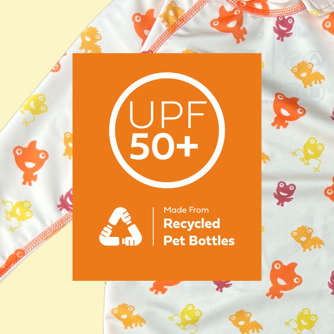Fibby UV-badetøj, lavet af genanvendte PET-flasker, tilbyder mere end 98% beskyttelse mod UVA- og UVB-stråler takket være det certificerede UPF50+ stof. Det åndbare materiale holder dit barn køligt og sikkert i solen.